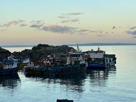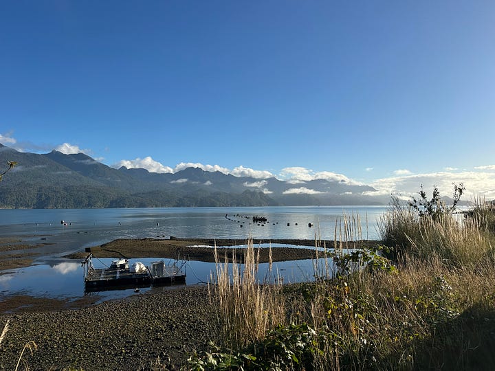 The road is empty. We zoom around the curves, throwing dust. This is the best morning, I smile. Alex points to a vista ahead and asks to stop. To stop? We hardly have enough time! But I pull over. She takes photos from the edge of the road. Steep mountains rise from the cold water on the opposite side. The fishing boats are laid up on the dirt sea bottom at low tide next to us. A small house at a distance. One boat is working around the aquaculture buoys. Its low rumble is the only soft noise in the steep barranca. A human noise, but it seems to belong.