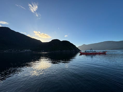 On the next ferry, we eat empanadas and drink coffee. Alex takes photos of the barranca unfolding around the peninsula. Of the sun, climbing over the snow of volcanoes behind the front range of the fjord. Of the other ferries, carrying fifty cars the other way.