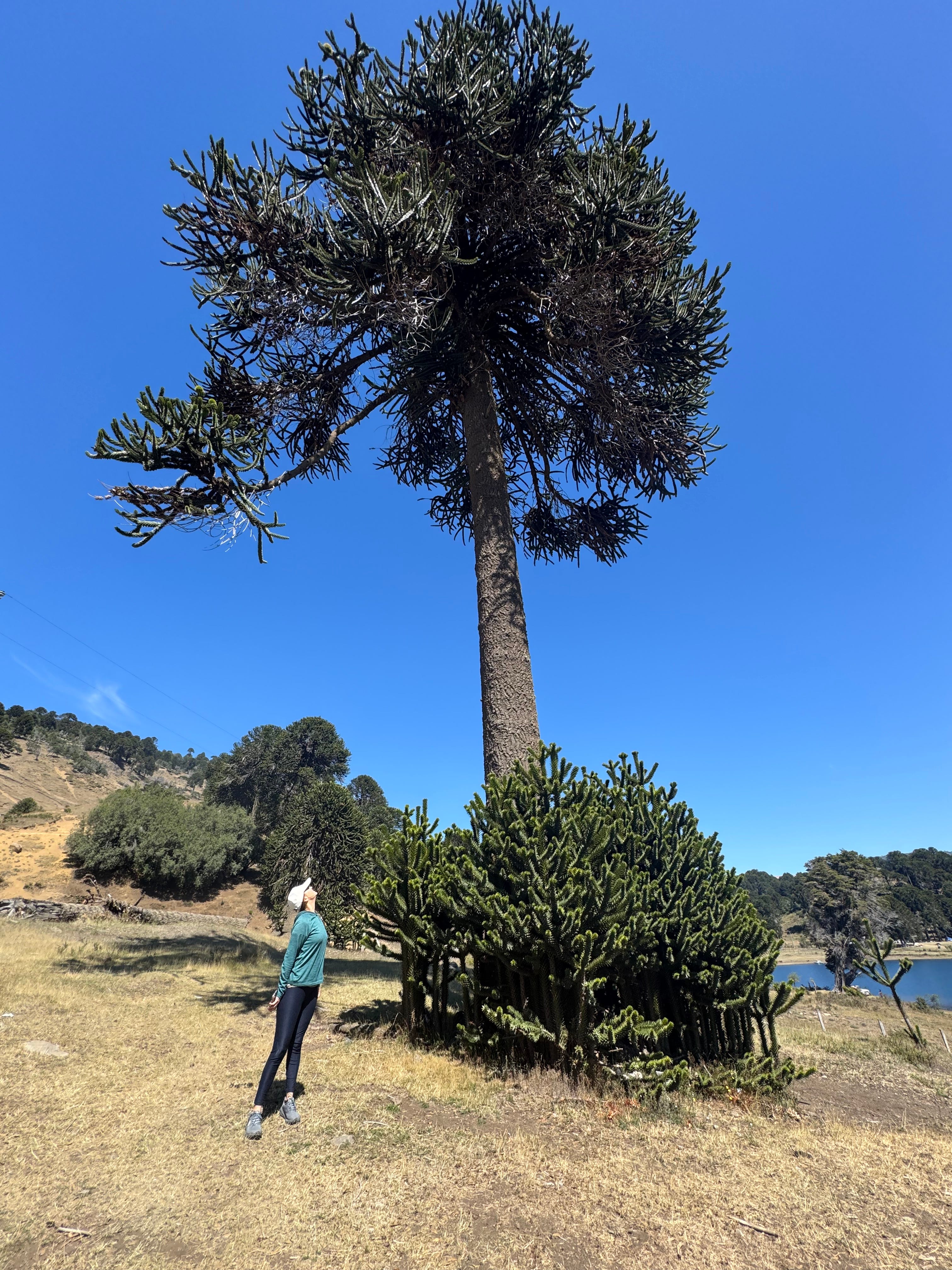 The road stops climbing and hugs the long lake. The lake is from a postcard. Only a family or two are swimming and kayaking every few hundred meters. Calm water, sun, gentle breeze. No concession stands, no cabins. Steep mountains are on each side. One mountain has a trail that climbs to the top and crosses into Argentina. We stop to look at it, but the slope is too steep. A Chilean flag is atop the hill. I suppose an Argentinian is next to it on the other side of the slope.