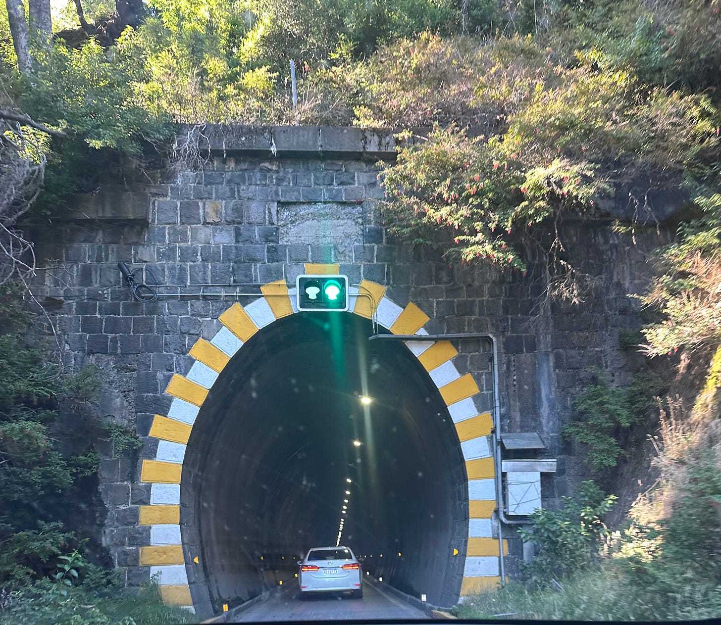 The light turns green, and we enter the narrow arch. The road inside is a single, paved lane. A row of lights is at the top of the arch and is only bright enough to eliminate the curved roof of the ceiling and the wet spot where the water seeps through the concrete. The car lights illuminate the roads