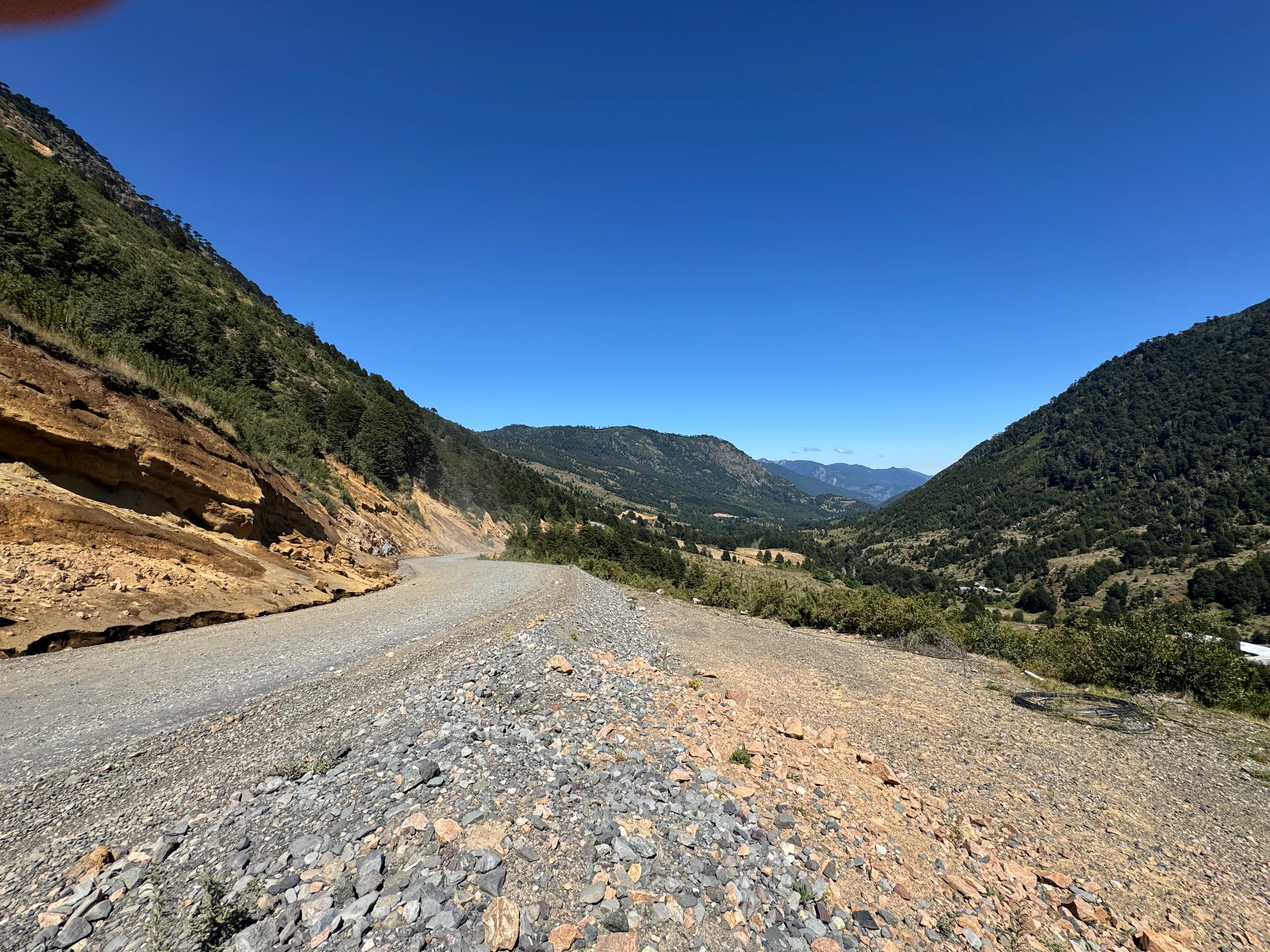.We drive. On the map, the road makes a long loop east and south, then west again to drop us back into the Central Valley some kilometers away. The road is twisty on the map, except for the straight two-kilometer section of an old one-way tunnel through the cordillera. The brush Argentinean border and a long mountain lake before traveling back inside Chile. Looks good. Why not?