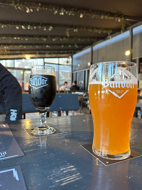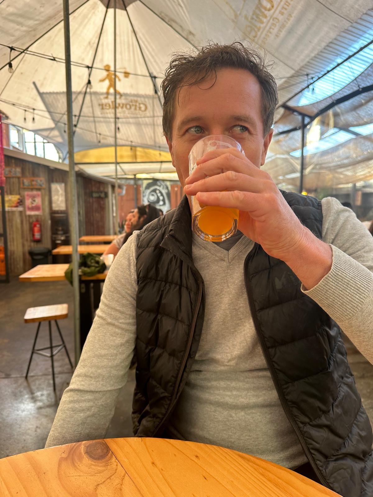 We split from the crowd and turn to El Growler. The brewery’s public space is a courtyard. A food truck and a separate trailer for the beer taps are under the tent roof. The post-college crowd fills most of the tables. A few tourists are here too. The tourists fumble through the menus. The locals order what they know without looking. There is a noisy buzz, a rapid chatter of Chilean Spanish. I order a small pour of West Coast IPA. Alex gets a juicy hazy. We see no reason to leave.