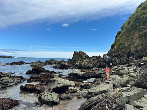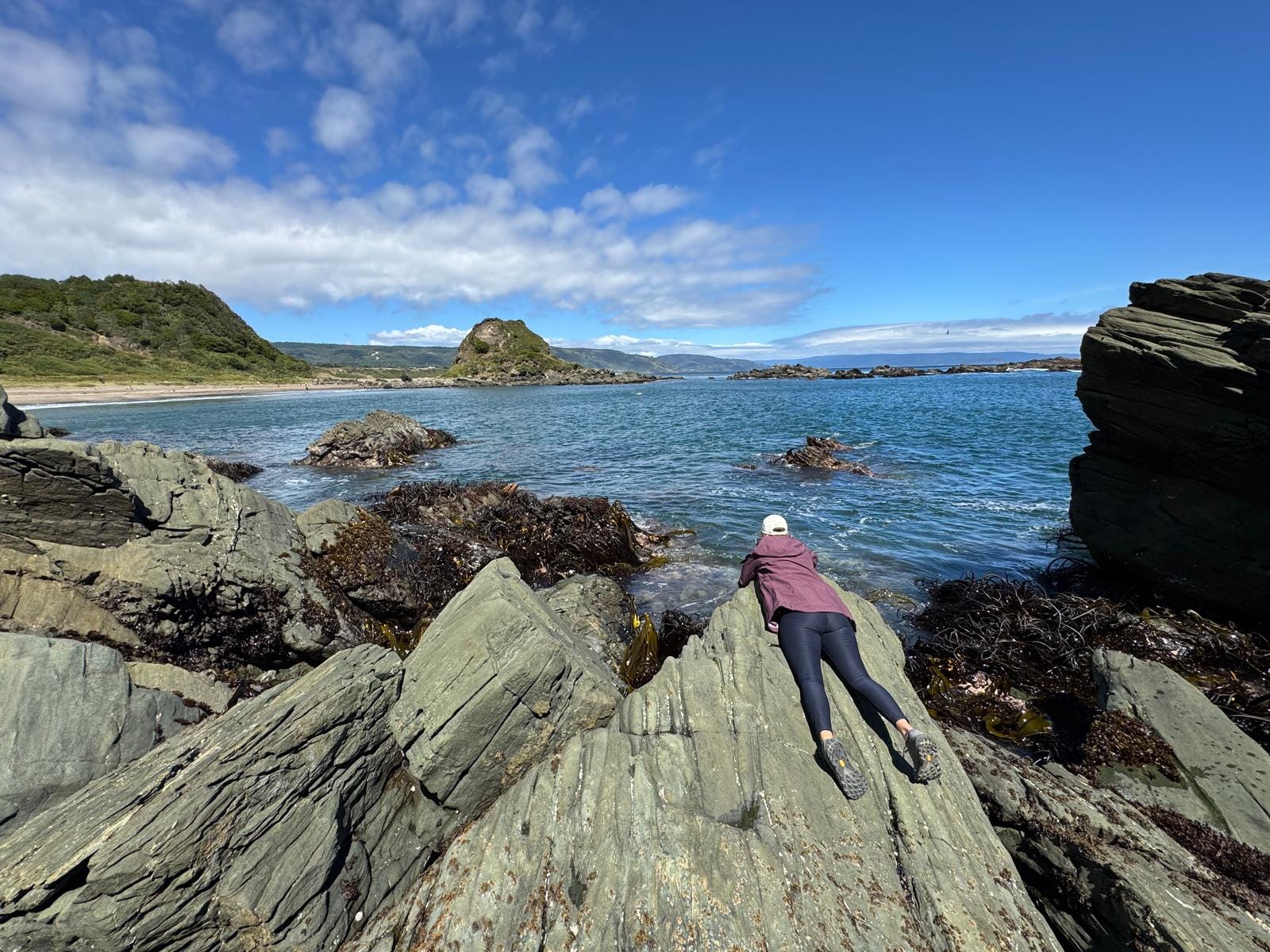 We park and descend towards the beach. The locals are in their bathing suits on the sand. I see swimmers in the bay. I am in pants, long-sleeve, and a down vest. It is cold. I convince Alex to climb over the boulders with me, around the bend in the coastline. The sea-otters gather there, on the rocks or on the mats of kelp just meters offshore. But the otters are not there, only rock and the cold Pacific.