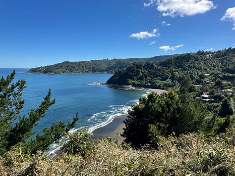 The next morning, I know we tried more beer samples than we should have. We want an easy day and drive along the river to the coast, fifteen minutes away. The Valdivia River widens to a large bay and meanders between steep hills, then spills into the cold Pacific Ocean. The road hugs the coastline, the tight curves relax through hamlets. Homes line the hills. Moored fishing boats line the shore. They are reminiscent of the lobster boats we see in the northern hemisphere, but the fishing deck is up front.